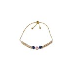 This vibrant gold trio bracelet features a polished gold-tone adjustable chain. The focal point is a striking combination of a soft pink center stone flanked by two deep blue accent stones, all complemented by a surrounding line of sparkling clear crystals. The adjustable slider mechanism offers a secure, refined fit for any wrist. Size,Standard